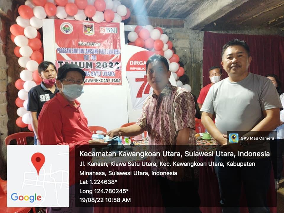 Penyaluran bantuan BLT bagi 100 keluarga penerima manfaat (KPM) tersebut diserahkan oleh Hukum tua Jones Sangeroki, bertempat di Kantor Hukum Tua Kiawa Satu Utara, Kecamatan Kawangkoan Utara Minahasa
