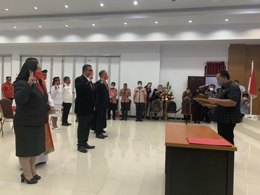 MINAHASA, Channelindo.com – Pergeseran pejabat dilingkup Pemkab Minahasa kembali dilakukan. Hal ini menyusul adanya pelantikan dan pengambilan sumpah jabatan pimpinan tinggi pratama jabatan administrator dan pengawas lingkungan pemerintah kabupaten Minahasa oleh Wakil Bupati Minahasa Robby Dondokambey, Kamis 13/10/2022, bertempat diruang sidang kantor Bupati.