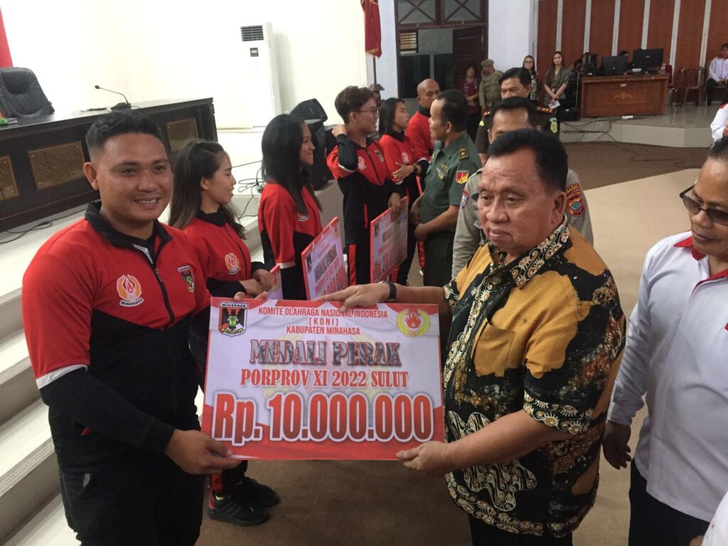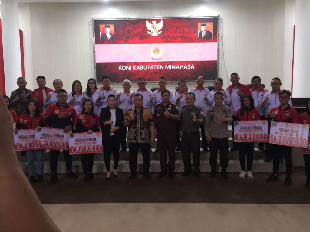 Atas apresiasi prestasi yang ditrohkan oleh para atlet, Ketua KONI Kabupaten Minahasa Glady Kandouw memberikan bonus 20 juta untuk peraih medali emas, 10 juta peraih medali perak dan 5 juta untuk atlet peraih medali perunggu serta pelatih masing-masing 1 juta juga cabor dengan jumlah beragam. Penyerahan bonus tersebut berlangsung di Kantor DPRD KAb. Minahasa, Kamis 30/3/2023.