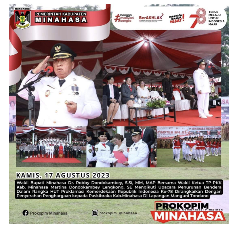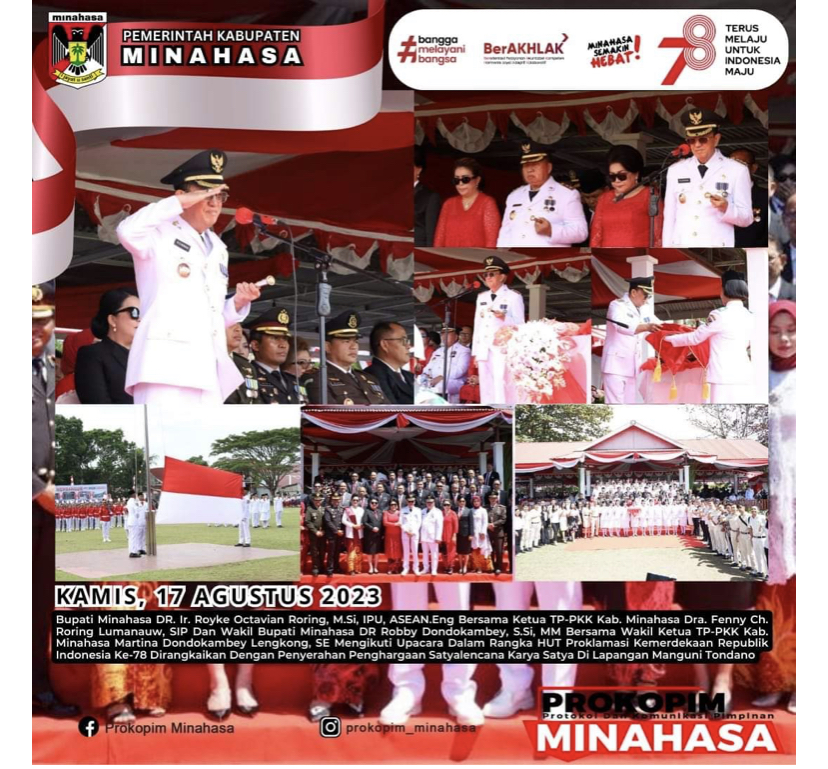 Channelindo.com, MINAHASA – Bupati Minahasa Dr Ir Royke Octavian Roring MSi, menjadi Inspektur Upacara (Irup) pada Pengibaran Bendera Merah Putih peringatan Hari Ulang Tahun (HUT) Kemerdekaan Repoblik Indonesia (RI) ke-78, Kamis, 17 Agustus 2023, bertempat di Lapangan Manguni Sasaran, Tondano.