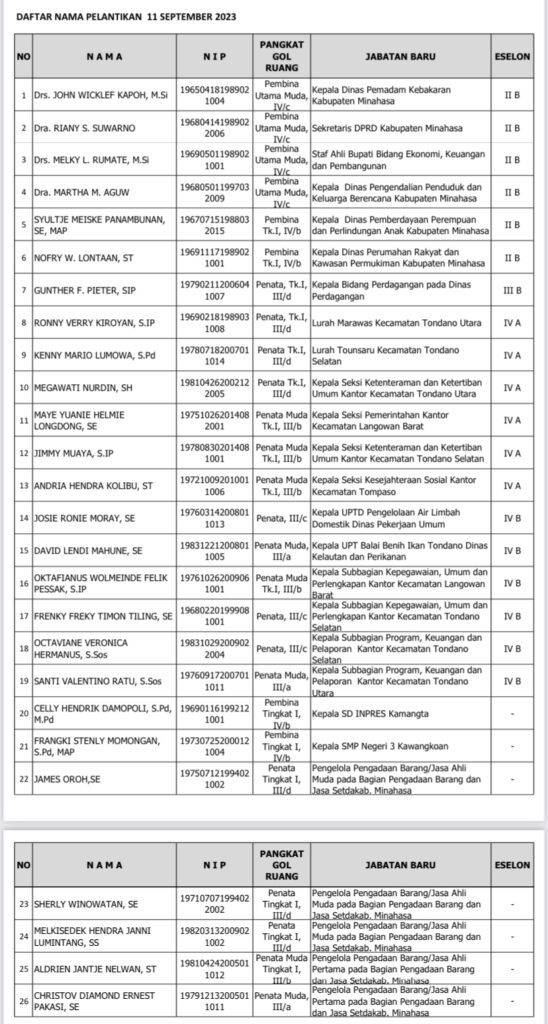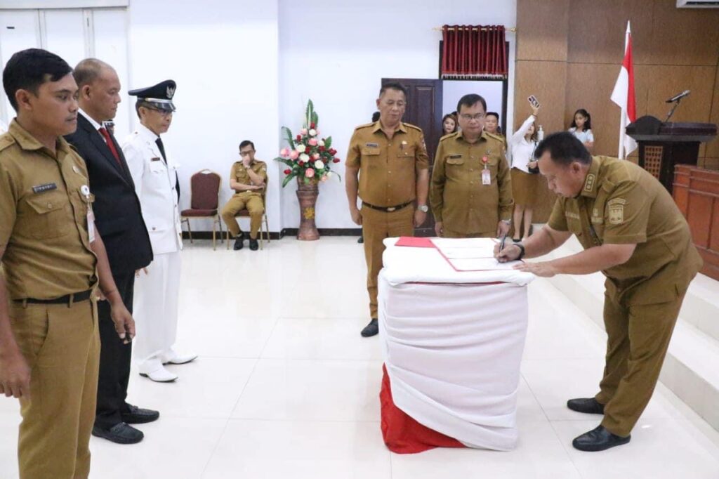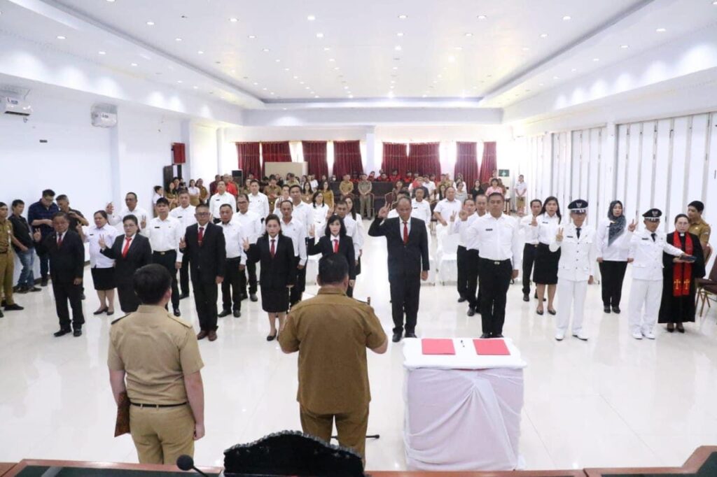 Channelindo.com, MINAHASA – Di akhir masa jabatannya sebagai Bupati dan Wakil Bupati Minahasa, Royke O Roring dan Robby Dondokambey melantik pejabat dalam jabatan Aministrator Pimpinan Tinggi Pratama, Jabatan Pengawas, Kepala Sekolah dan Jabatan Fungsional tertentu, di ruang sidang Kantor Bupati Minahasa Tondano, Senin 11/9/2023.