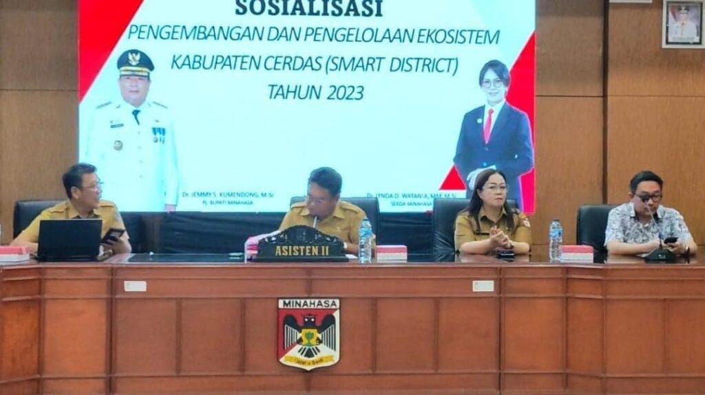 Channelindo.com, MINAHASA – Dinas Komunikasi dan Informatika (kominfo) kabupaten Minahasa yang dipimpin Kadis Maya Kainde, SH, MSi menggelar sosialisasi pengembangan dan pengendalian ekosistim kabupaten cerdas (Smart District) Tahun 2023, di ruang sidang kantor bupati, Selasa (12/12/2023) pagi.