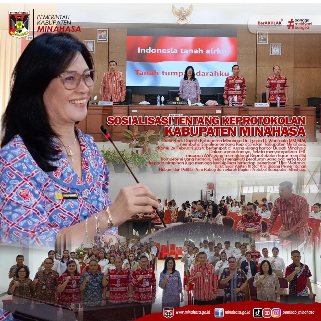 Hal tersebut disampaikan Sekretaris Daerah (Sekda) Kabupaten Minahasa Lynda D Wantania MM MSi saat membuka kegiatan sosialisasi tentang Keprotokola, di Ruang Sidang Kantor Bupati Minahasa, Kamis 29/2/2024.