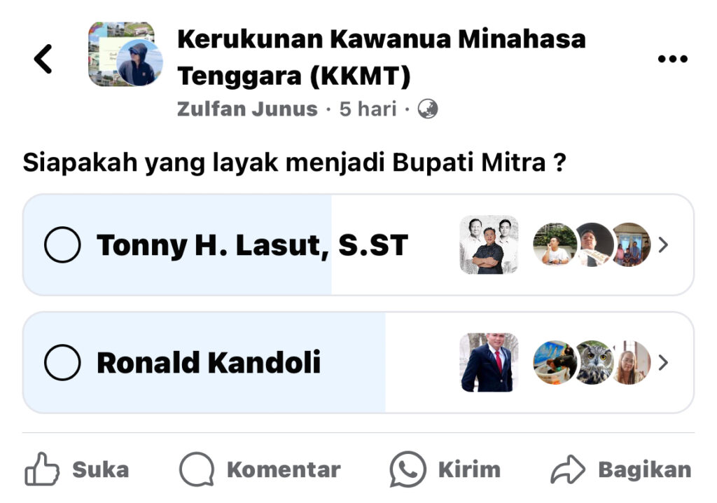 Channelindo.com, MITRA – Kian dekatnya Pemilihan Umum Kepala Daerah (Pilkada) Minahasa Tenggara (Mitra) beredar survey di media sosial Facebook (FB) terkait siapa yang layak untuk memimpin Kab Mitra kedepan.