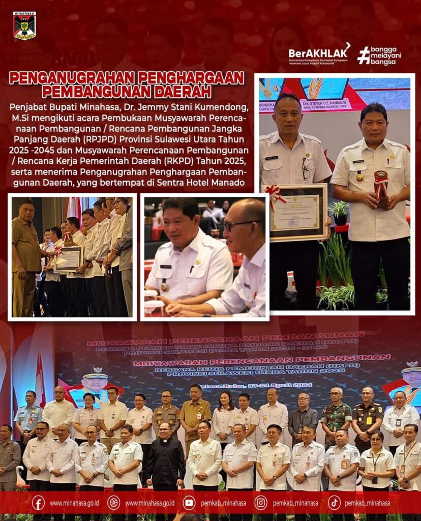 Dalam kesempatan itu Penjabat Bupati Minahasa Dr Jemmy S Kumendong M.Si menerima penganugerahan penghargaan pembangunan daerah yang diserahkan langsung oleh Gubernur Sulut Olly Dondokambey SE..