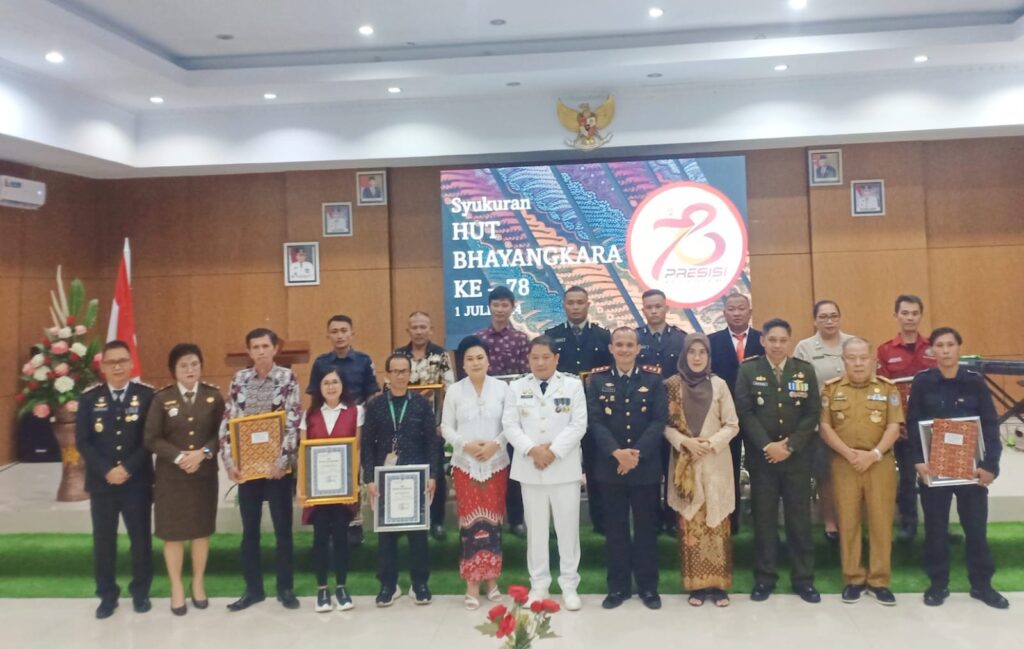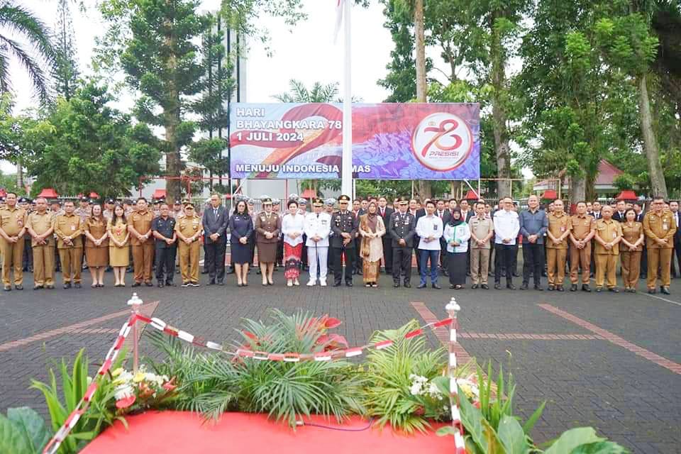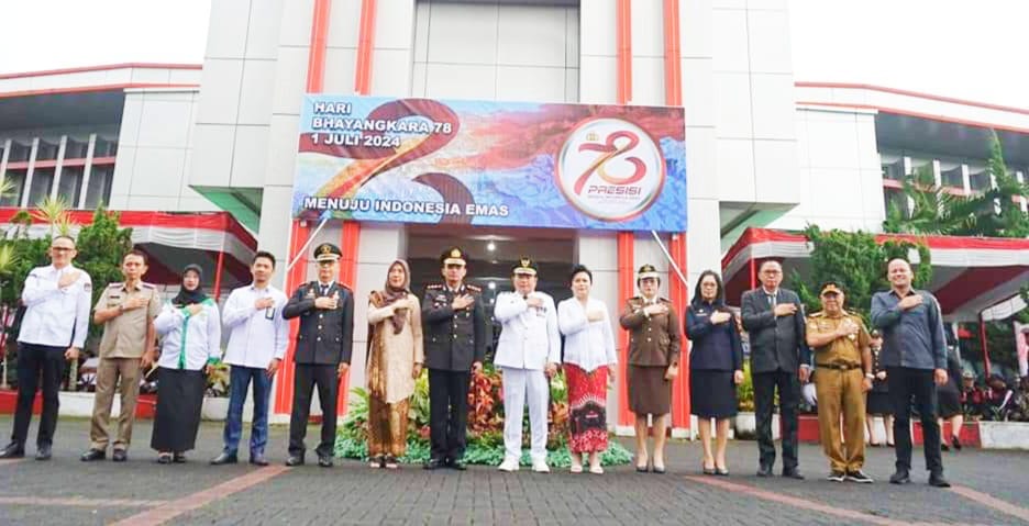 Channelindo.com, MINAhASA- Penjabat Bupati Minahasa Dr. Jemmy Stani Kumendong M,Si, bersama Ketua TP- PKK Ny. Djeneke Kumendong- Onibala SH, MSA, serta Sekretaris Daerah Kabupaten Minahasa Dr. Lynda D. Watania MM, M,Si, mengikuti upacara peringatan Hari Bhayangkara Ke- 78, bertempat di Halaman Kantor Bupati Minahasa, Senin (1/7/24).