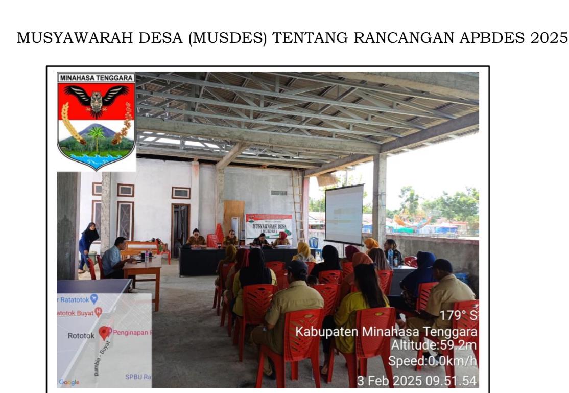 Channelindo.com, RATATOTOK – Hukum Tua Desa Ratatotok Natsir Puili SE memimpin langsung kegiatan musyawara desa (Musdes) tentang rancangan Anggaran Pendapatan dan Belanja Desa (APBDES), Senin 3 Februari 2025.