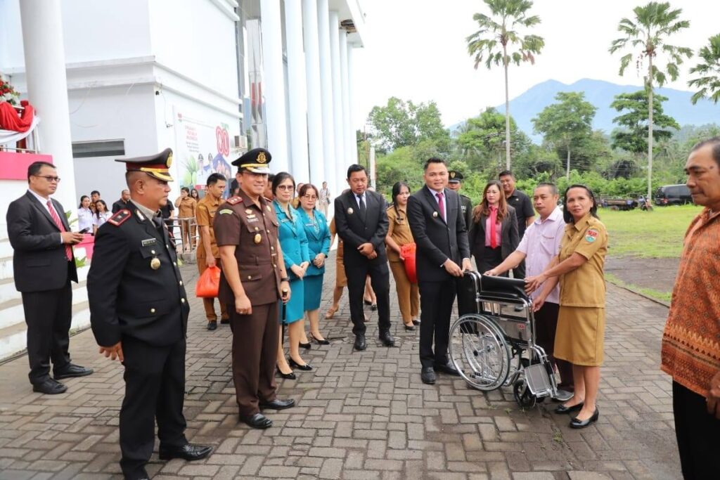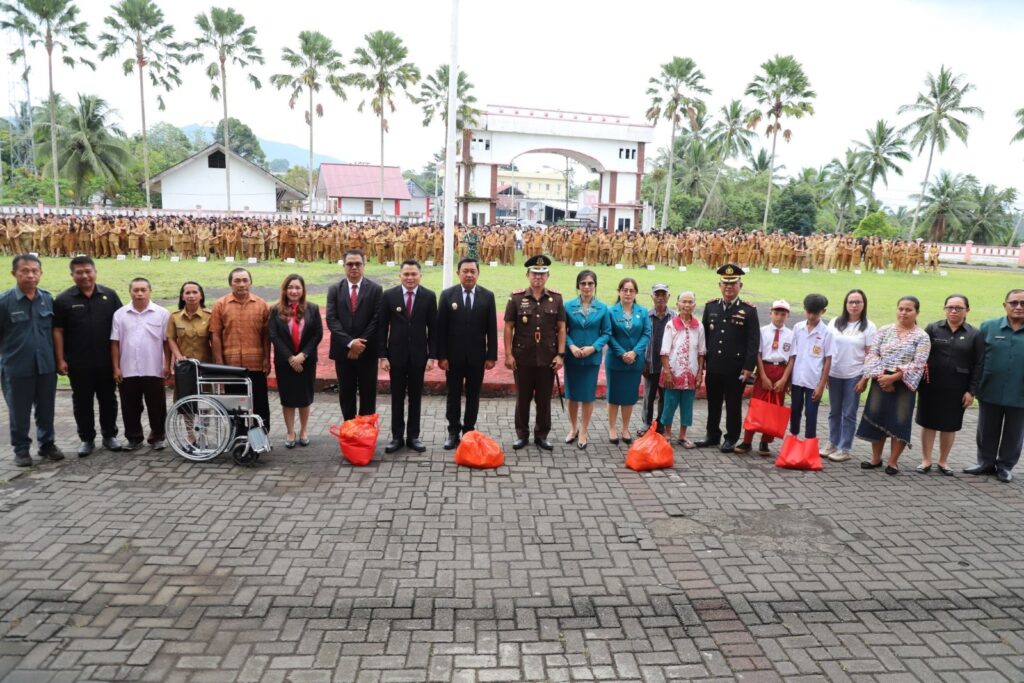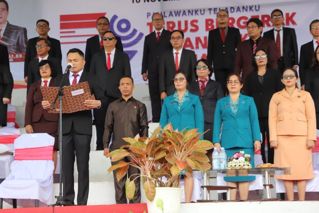 “Semangatnya tetap sama: membela yang lemah, memperjuangkan keadilan, dan memastikan tidak ada anak bangsa yang tertinggal,” tegasnya. Sebagai wujud nyata kepedulian sosial, rangkaian peringatan Hari Pahlawan juga diisi dengan penyerahan bantuan sosial kepada masyarakat. Bupati Ronald Kandoli bersama Ketua TP-PKK Ny. Stefa Kandoli Antou, Wakil Bupati Fredy Tuda, serta jajaran Forkopimda menyerahkan secara simbolis paket sembako untuk penyandang disabilitas dan lansia, kursi roda, serta seragam sekolah bagi siswa SD dan SMP.