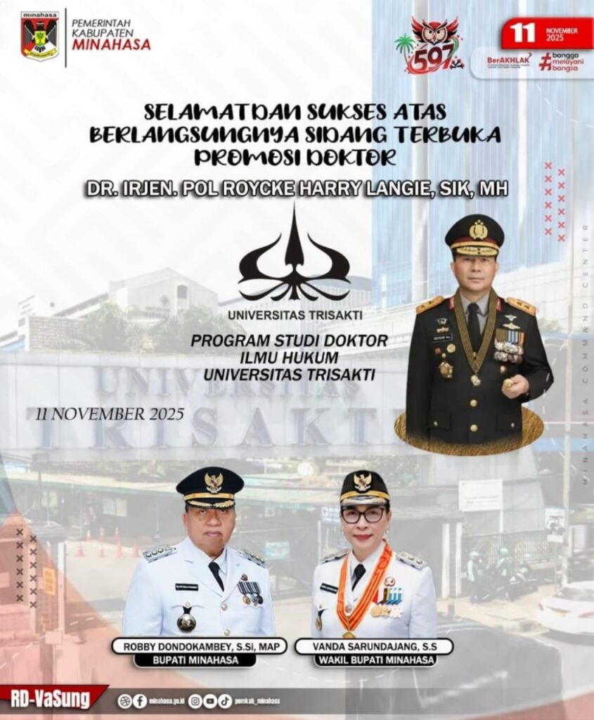 Channelindo.com, JAKARTA – Pemerintah Kabupaten Minahasa mengucapakan selamat atas keberhasilan Kapolda Sulut Irjen Pol Royke H Langie atas ujian promosi doktor yang berlangsung di Universitas Triksakti Jakarta, Selasa 11/11/2025.