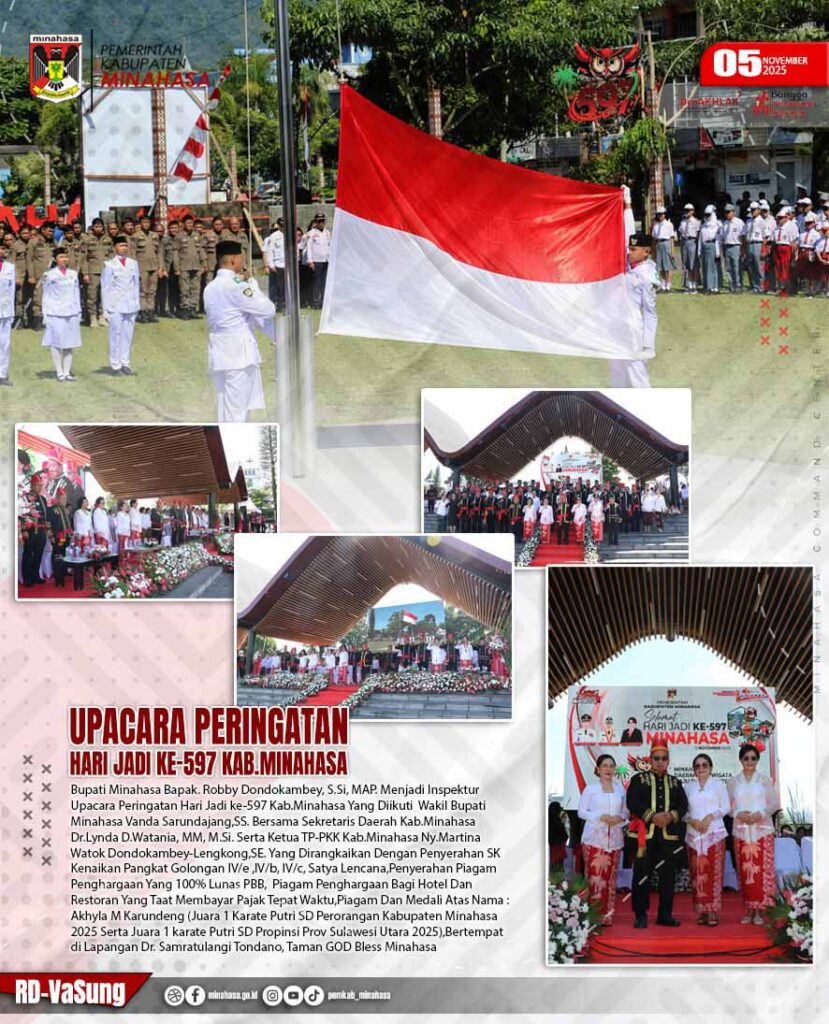 Channelindo.com, MINAHASA – Pemerintah Kabupaten Minahasa menggelar puncak perayaan Hari Jadi Minahasa ke 597, 5 November 2025. Peringatan Hari Jadi Minahasa ini diawali dengan Upacara Bendera di Lapangan Sam Ratulangi Tondano.