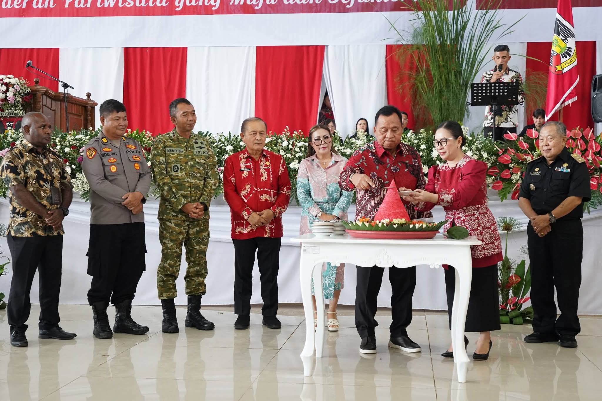 Suasana penuh sukacita dan optimisme terlihat saat kedua pemimpin Minahasa itu melakukan prosesi pemotongan tumpeng sebagai simbol rasa syukur atas perjalanan pemerintahan sejak dilantik Presiden Prabowo Subianto pada 20 Februari 2025.