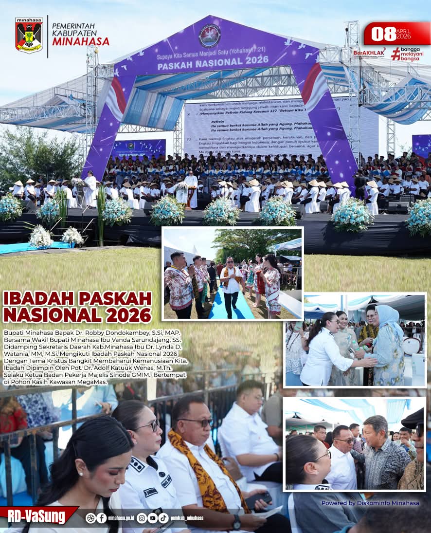 Channelindo.com, MANADO – Bupati Minahasa Dr Robby Dondokambey SSi MAP, bersama Wakil Bupati Vanda Sarundajang SS, menghadiri ibadah perayaan Paskah Nasional 2026, berlokasi di Pohon Kasih, Kawasan Mega Mas, Kota Manado, Rabu (08/04) pagi.